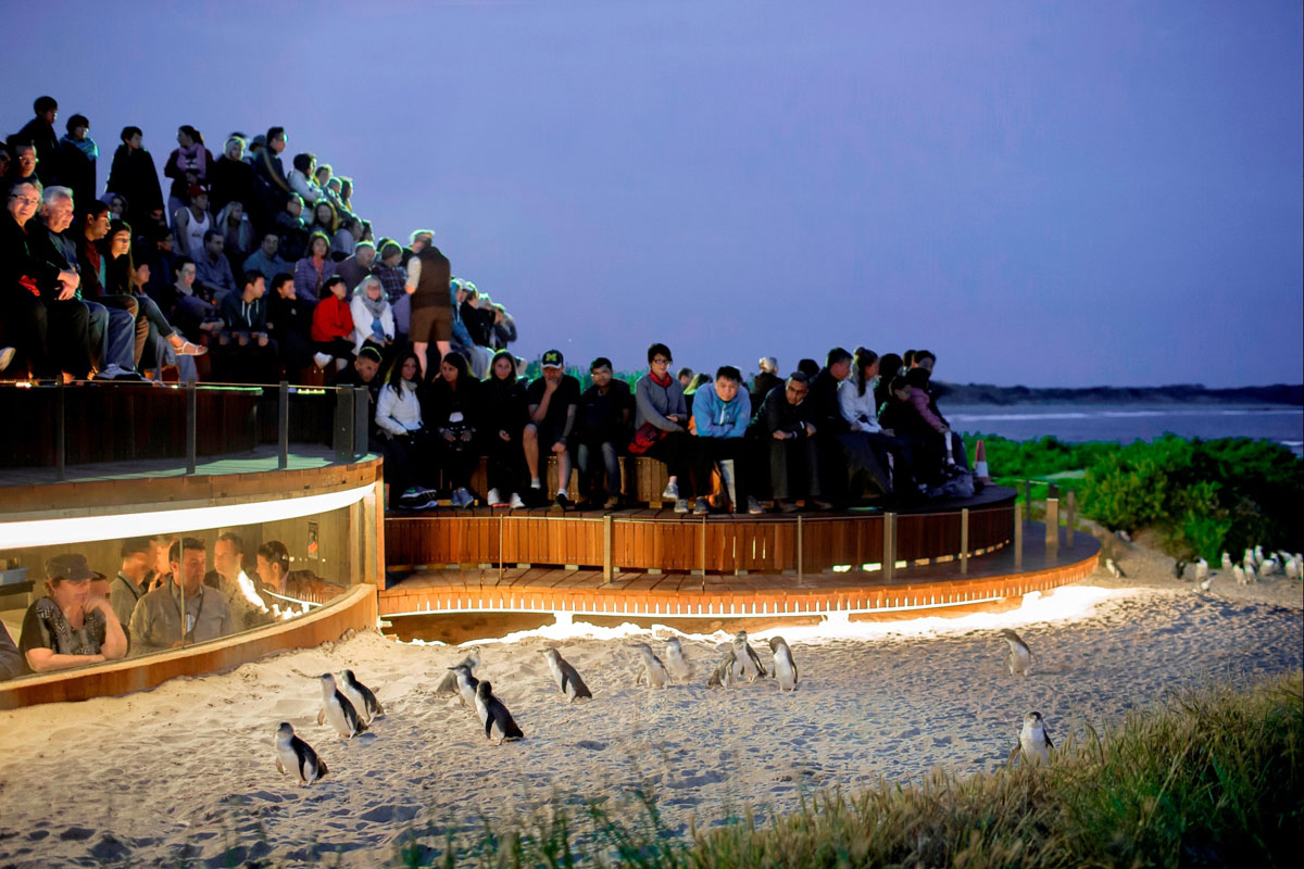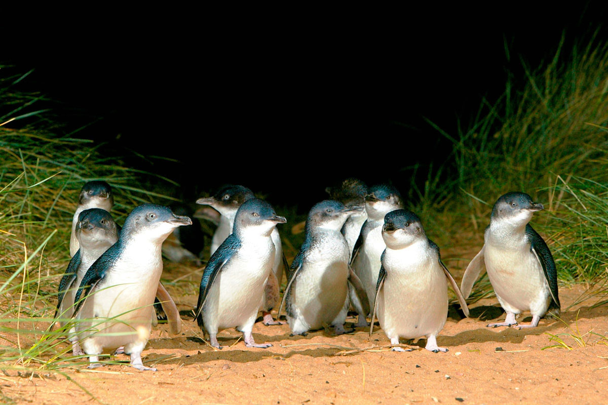 菲利浦島自然公園是目前世界上最大的小企鵝保護基地。在這裡有大批的野生動物專家從事企鵝的研究和保護工作。據統計,世界上一共有17種企鵝,全部居住在南半球,而小藍企鵝是澳洲獨有的品種。小企鵝會在每天太陽落山時回到這裡,形成難得一見的企鵝歸巢奇觀。黃昏後,來自世界各地的遊客秩序井然依次坐在海灘邊,等待小企鵝歸巢。小企鵝白天離開小島,遊到離岸一、二百公里的深海覓食 ,每當日落黃昏後,一隻只嬌小的企鵝嘴裡銜滿食物從這裡經過,準備回去餵養巢穴中企鵝寶寶。小企鵝那種胖乎乎、憨態可掬的樣子真是可愛極了。